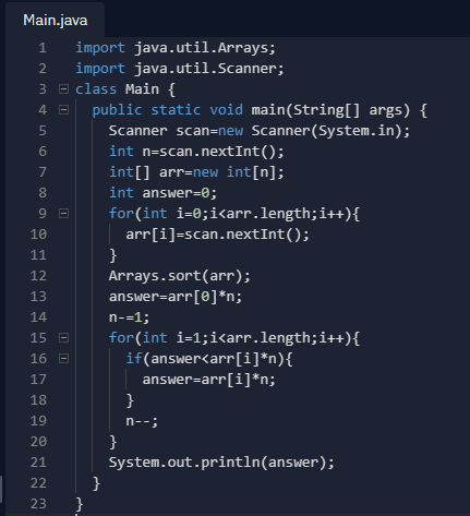 각 로프들에 대한 정보가 주어졌을 때, 이 로프들을 이용하여 들어올릴 수 있는 물체의 최대 중량을 구해내는 프로그램을 작성하시오. 모든 로프를 사용해야 할 필요는 없으며, 임의로 몇 개의 로프를 골라서 사용해도 된다.