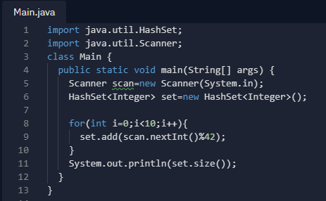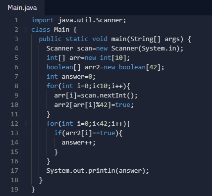 출력: 첫째 줄에, 42로 나누었을 때, 서로 다른 나머지가 몇 개 있는지 출력한다.