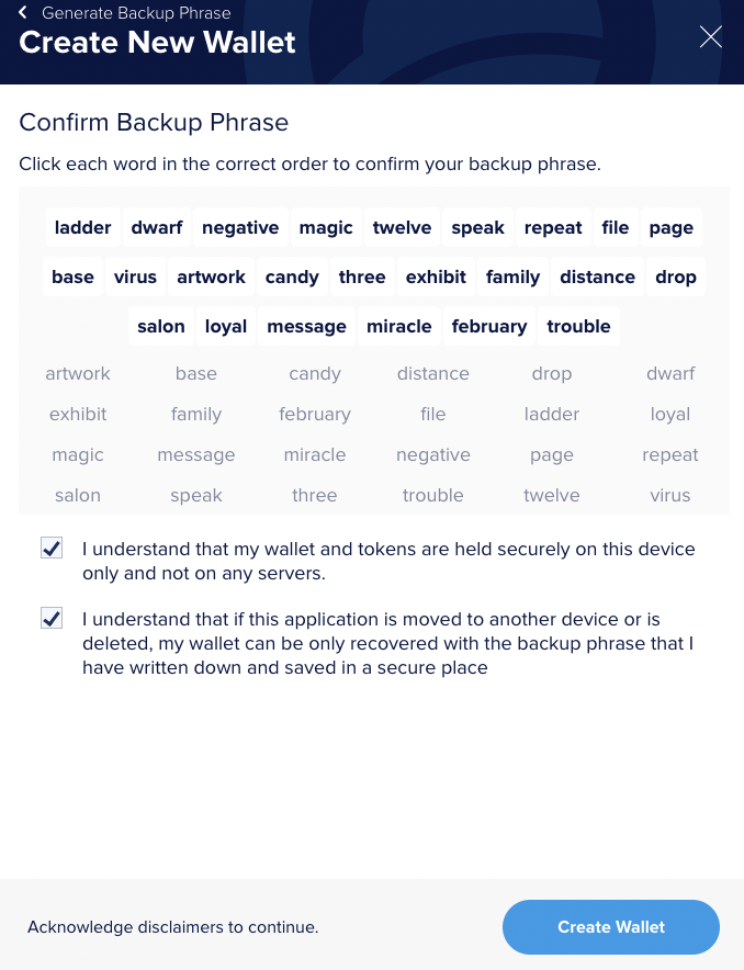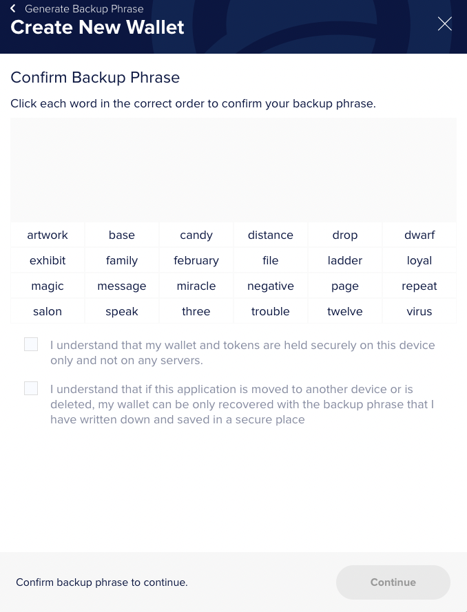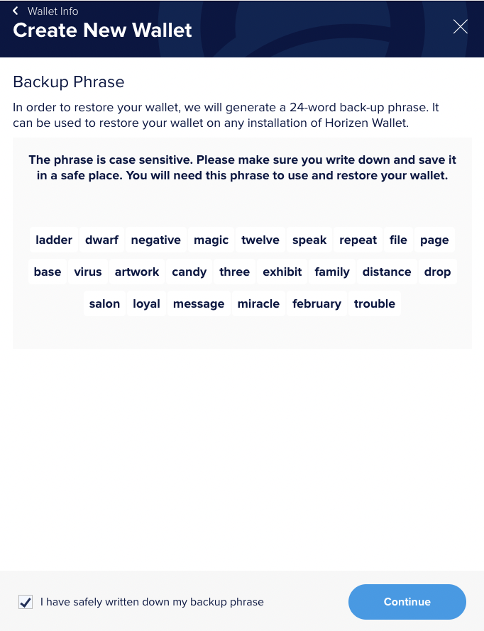-> Backup Phrase로 생성 되는 24개의 단어들은 지갑을 복구 시 필요하기 때문에 이미지 or 텍스트로 꼭 저장해 두도록 합니다. (공유 금지)