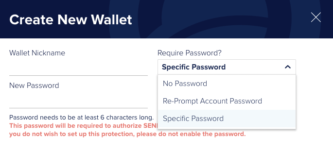 -> 지갑 보호를 위해 Specific Password를 선택하여 지갑 비밀번호를 설정합니다.