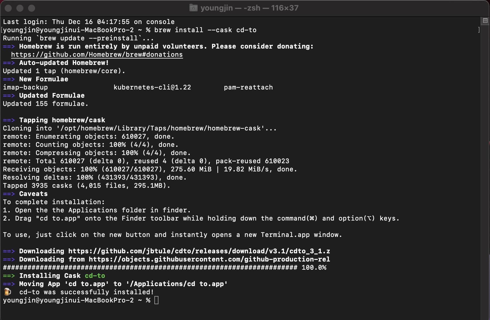 terminal 실행 후 "brew install --cask cd-to"를 입력하게 되면 관련 파일이 다운로드 되어지며 cd to Appication이 설치되게 된다.