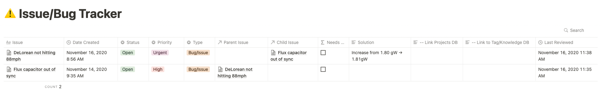 Issue나 Bug 발생 시, 팀원들과 공유를 위해 Notion의 자체 기능을 찾아본 결과 따로 issue, bug tracker 양식은 따로 존재하지 않고, 보기 option 중 table을 커스텀 해서 사용해야 하는 것 같다.